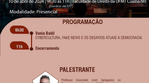 ‘Cybercultura, Fake News e os Desafios Atuais à Democracia’ são os temas que serão debatidos em palestra na manhã desta quarta-feira (10/04), das 9h30 às 11h, na Sala de Mestrado do Programa de Pós-Graduação de Direito da Universidade Federal de Mato Grosso. O curso está com as inscrições abertas é voltado para magistrados, servidores, assessores e estagiários (link no fim da matéria). Ao todo, são ofertadas 50 vagas. O evento é realizado em parceria entre a Escola Superior da Magistratura de Mato Grosso (Esmagis-MT) e o Programa de Pós-Graduação em Direito da Universidade Federal de Mato Grosso. “Ainda durante a palestra, também serão abordados temas como novas tecnologias e datacracia, pautas cotidianas na atual sociedade, em nível mundial, as quais necessitam ser verticalizadas em face de sua conexão com temas decisórios”, explica o juiz coordenador das atividades pedagógicas da Esmagis-MT e também do evento, Antônio Veloso Peleja Júnior. Ele explica também que o evento será pró-bono para o Poder Judiciário, tendo em vista que o palestrante não cobrou contrapartida financeira.