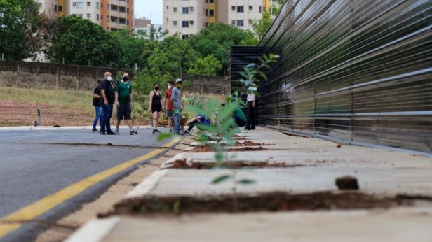 Esta matéria possui recursos de texto alternativo para promover a inclusão das pessoas com deficiência visual. Imagem 1: foto horizontal colorida de mudas sendo plantadas na calçada de um prédio em Cuiabá. Em primeiro plano está uma muda plantada e ao fundo há pessoas em pé e agachadas mexendo nas mudas. Imagem 2: foto horizontal colorida de um homem abrindo o berçário para plantar uma muda de árvore. Em um espaço com capim e algumas árvores atrás, ele está agachado com uma pá na mão. Ele veste calça jeans, camiseta do Verde Novo, luvas, máscara e um boné marrom com proteção.